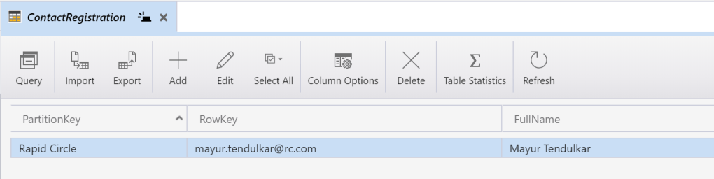 As mentioned earlier, for storing details, I’m using Azure Table Storage and this is Microsoft Azure Storage Explorer view of it. You can see I’m using Organization as PartitionKey and Email ID as RowKey. This will help to store and manage data easily.