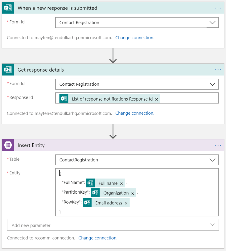 The last bit of this app is to get data from Microsoft Forms and pull it into Azure Table Storage for further utilization. Luckily, there is Azure Logic Apps connector available for Microsoft Forms. However, the trigger used here is available only if you sign in with Work/School or Office 365 account. I hope, this trigger will be made available for normal Microsoft account based Microsoft Forms as well.