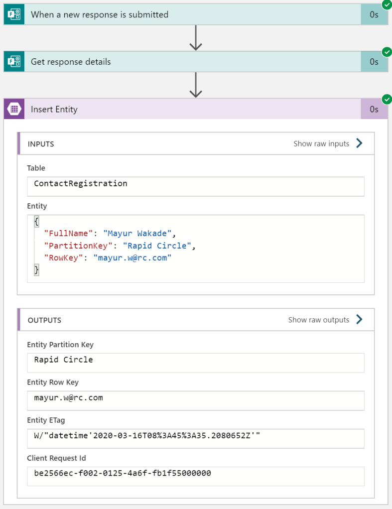 Just save this Azure Logic App and it will execute whenever there will be a new entry in the Microsoft Form. You can see the details about this entry and execution details on Azure Portal.