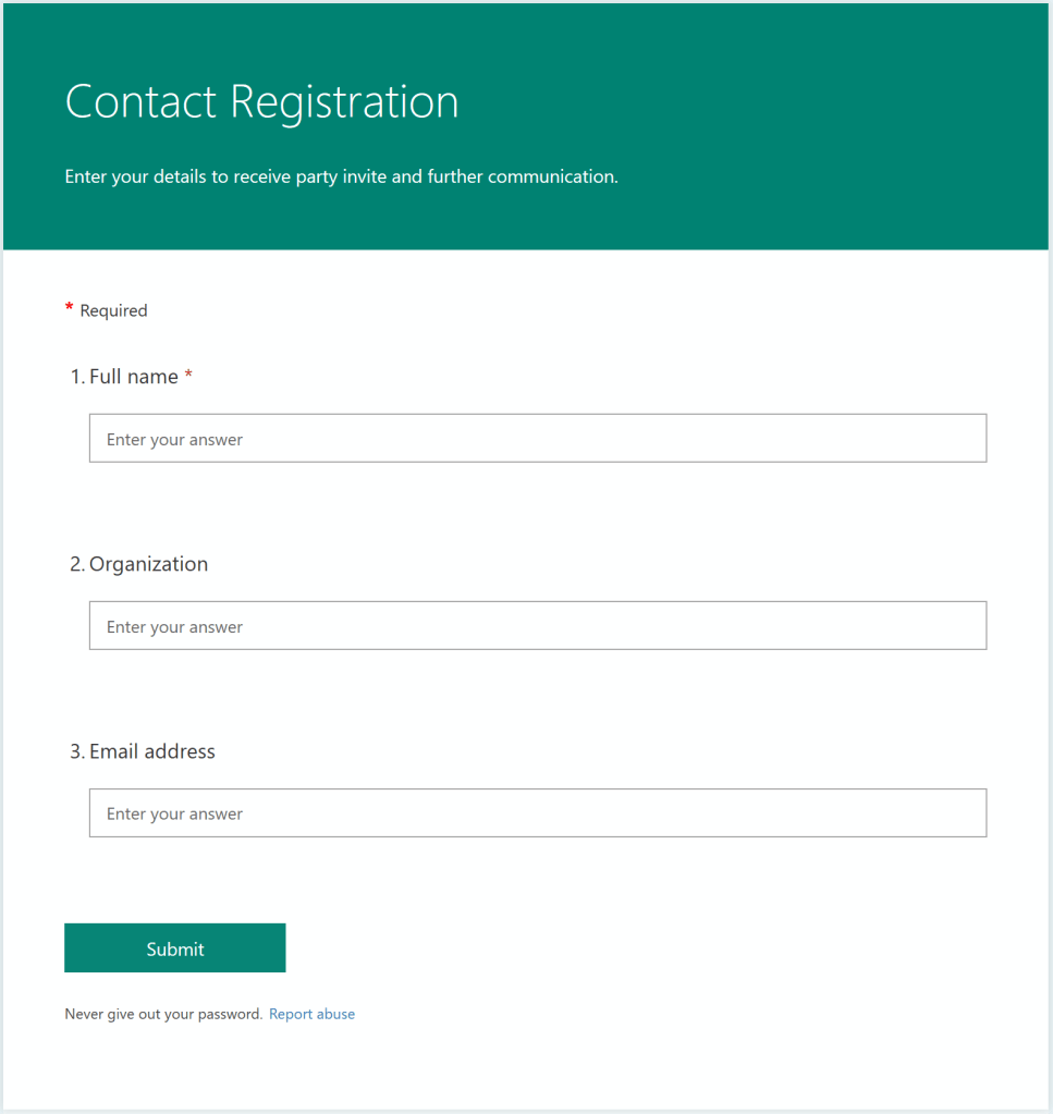 Rather than writing HTML & JavaScript for this simple page, I thought about using technology which is designed for this purpose: Microsoft Forms. I created a Form and designed it to accept details from users (including people outside my organization).
